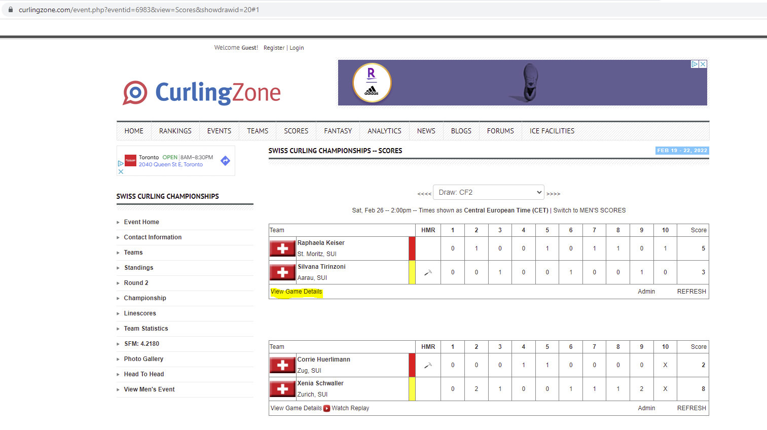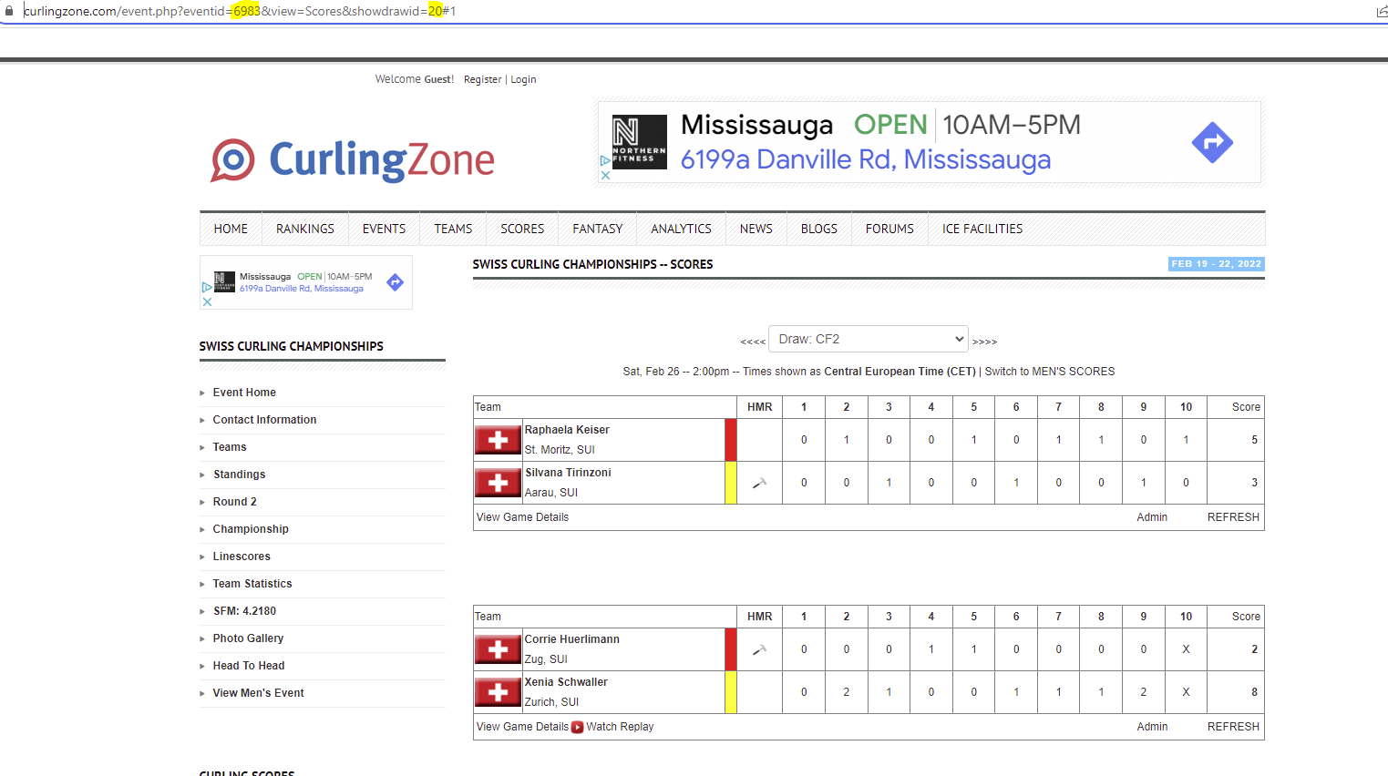 Instead of navigating to a game details page, the boxscore can be scraped right from the linescore page using the CurlingZone event id, draw id and game number. The image below highlights the CurlingZone event and draw id (6983 and 20 respectively in this case).